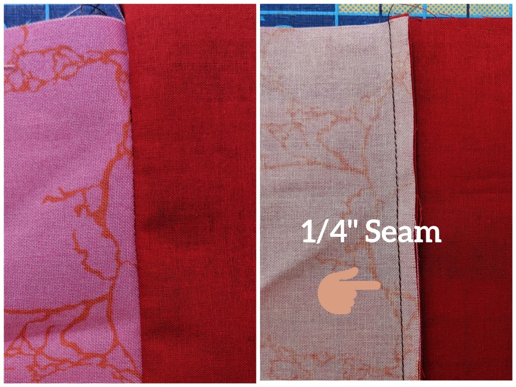If you are piecing a quilt top, you usually create a series of blocks and then sew the blocks together into bigger blocks and on and on. Most blocks are pieced using a quarter inch seam. You might also hear the term “scant quarter inch,” which means a seam that is just one or two thread widths shy of a true quarter inch.