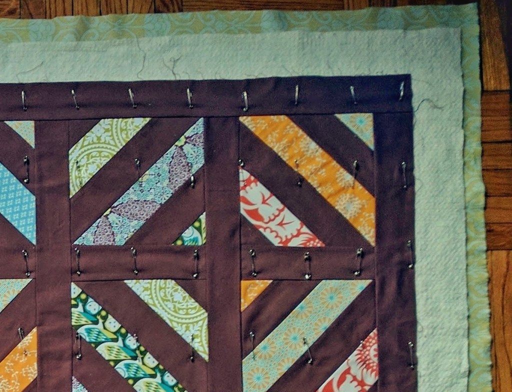 Once you’ve prepared the three layers of your quilt, you need to baste them together before you quilt them.  Basting is simply a no-nonsense way of putting layers together so they don’t move when you are ready to do more controlled sewing. At this point in my quilting journey, I pin baste all of my quilts using curved safety pins.  However, there are several methods for basting a quilt, and the method you choose is simply a matter of personal preference.