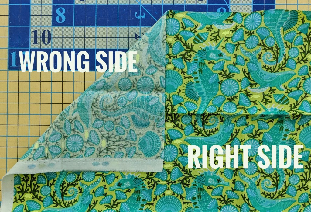Quilting cottons come in a huge variety of prints and solids.  Printed fabrics will have a right side and a wrong side.  The right side is the side with the printed design on it.  The wrong side will look like a faded version of that design or not have the design on it at all.  Solids usually don’t have a right or wrong side — both sides are the same.