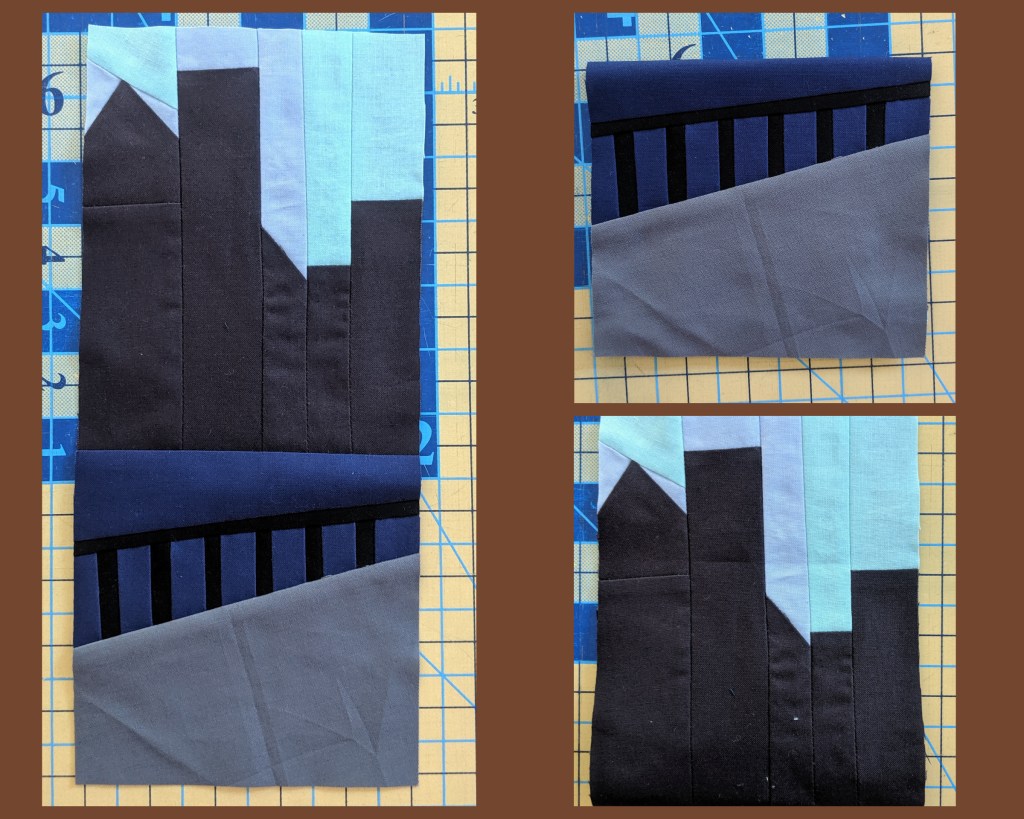 One of the aspects of my design that I need to figure out is the size of each of the blocks. I decided to pick one of my sketches that would probably require the largest size block and see where to go from there. The block is based on the view of Manhattan from the Brooklyn Promenade in Brooklyn Heights. Keep in mind I’m just using scrap fabric, so this is not necessarily the color scheme I’m going with for the overall quilt. I like the overall outcome of this block, especially the railing of the promenade, but I made my first discovery soon after finishing this block. I realized that this was looking way too literal for my overall vision of the quilt. After making this block I realized I really want my blocks to be far more abstract. Simply by splitting the skyline from the promenade, I created two abstract blocks that I preferred far more than the original one.