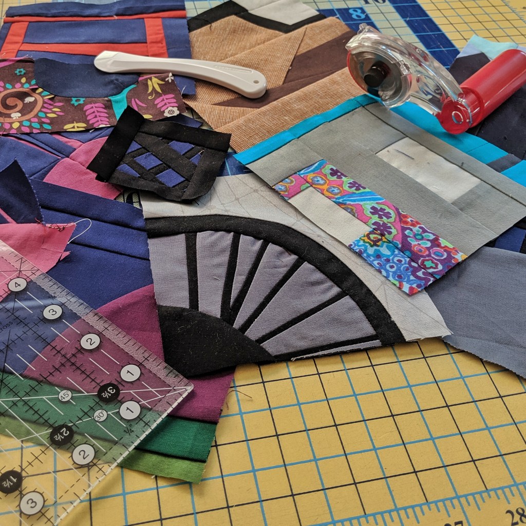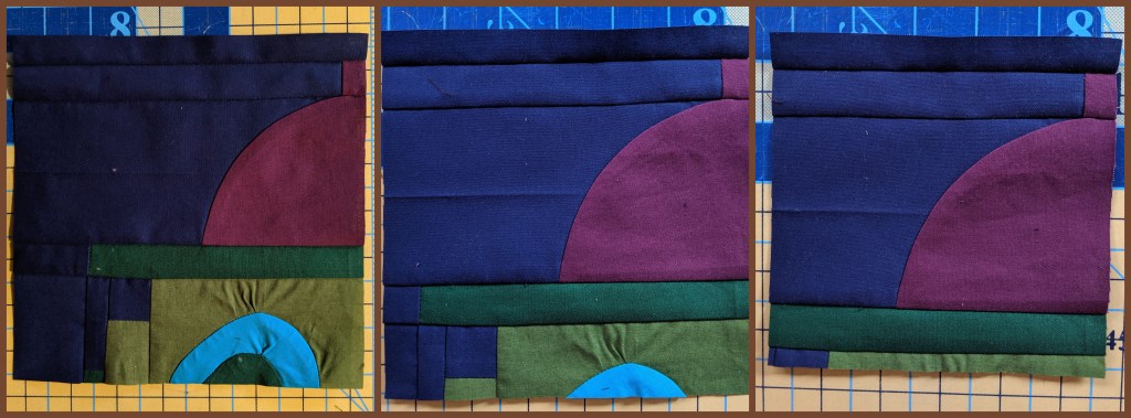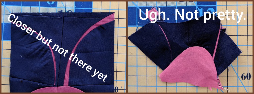 Since I had such success with my bicycle wheel, I decided to attempt more improv curves with my cockroach block. Blech! What a disaster! The first one did not work AT ALL. For the second attempt, I created two separate blocks and then sewed them together. It’s better, but it’s still not what I ultimately want. I’ll need to keep working on this one before I attempt it with whatever real fabrics I’ll ultimately choose for the quilt.