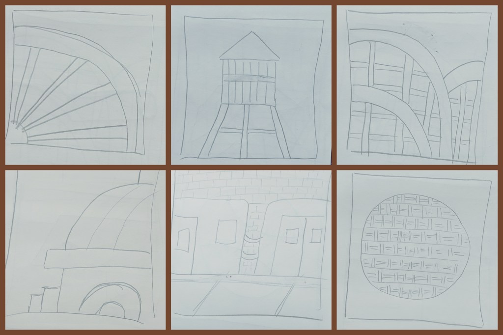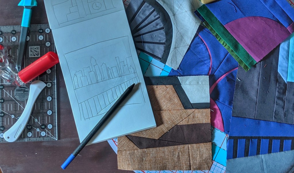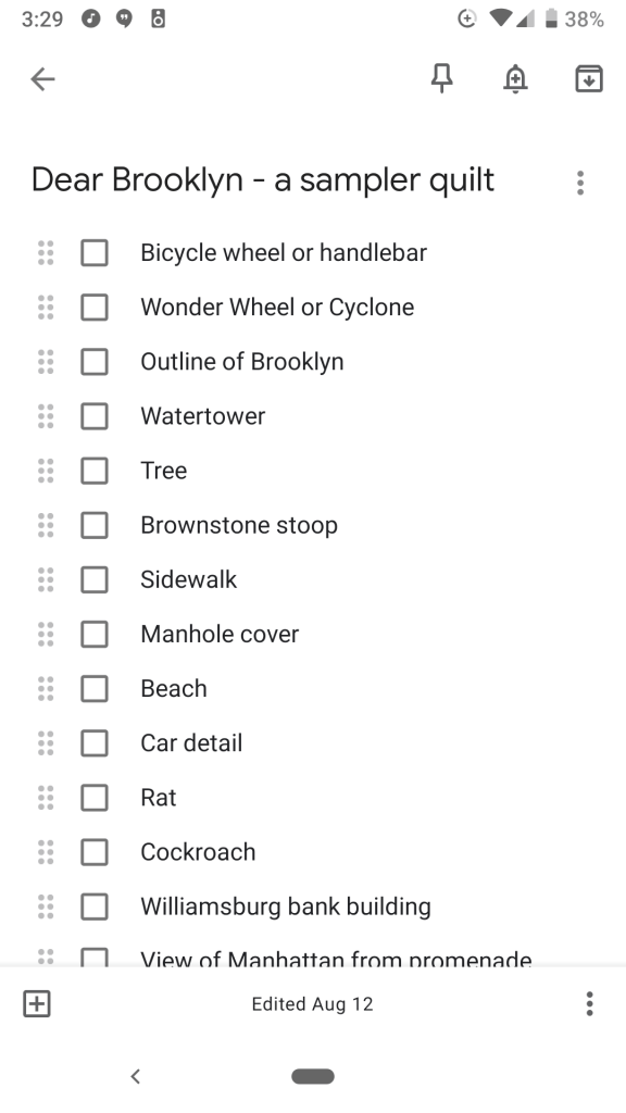 So now I’ve made some decisions about my overall quilt design. Because I’m ultimately an improv piecer, I’m going to be using improv piecing for all of my blocks, which means they’re all going to come out to whatever size they come out to. But then I’m going to cut them all down to 5.5″ squares. And depending on how large the original blocks turn out, I might be able to get more than one 5.5″ square out of it. This also means I’m definitely making my blocks more abstract than realistic. Perhaps a future Brooklyn-inspired quilt will use these same sketches for something more realistic, but this one is going to be modern as hell (or at least that’s my goal).