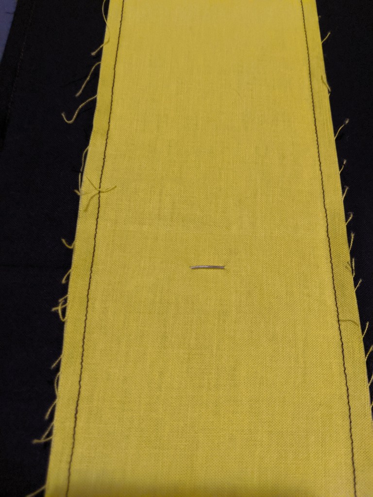 Once the backing was complete, it was time to make the quilt sandwich. Just as a reminder, a quilt generally consists of the top and the backing with the batting in between. Because this quilt wasn’t terribly large, I was able to clear out a space on my apartment floor and tape the backing down. I put a safety pin in the very middle of the backing so that I could line up the batting and quilt top, ensuring everything was perfectly centered.