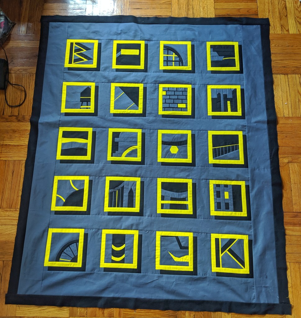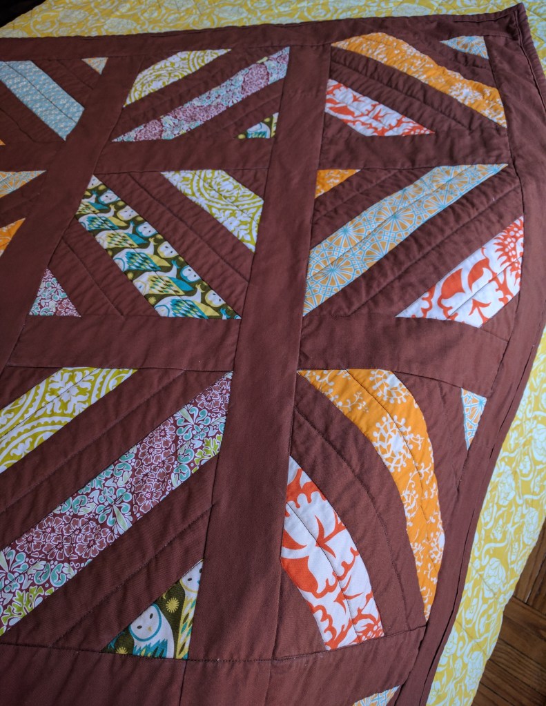 Surprise, surprise — it wasn’t quite enough fabric, which meant I either had to go out and buy more, or I could take my scraps and piece together a back. I opted for the fiscally responsible choice. My first idea was to make a super scrappy section of the backing, which would have been totally fun but was going to take way more time than I wanted to spend on it. Then I realized I had a nice long strip of the pear fabric that could be used as the centerpiece. I went ahead and surrounded that by some long strips of the gray and black I had left over, and — voilà! — I suddenly had a very cool-looking, contemporary quilt back to complement my very cool-looking, contemporary quilt top (I mean, very cool looking in my opinion at least).