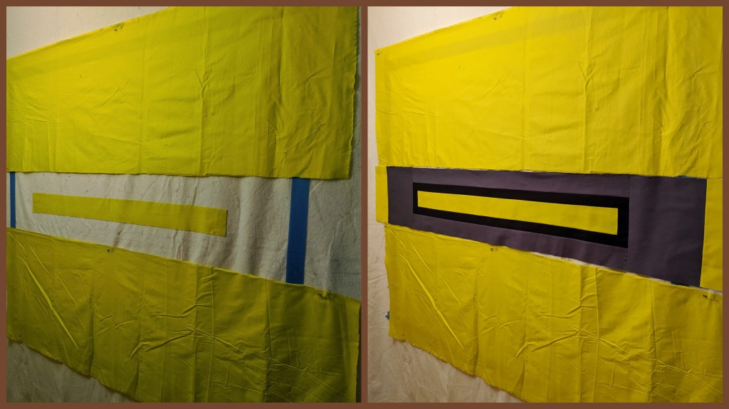 However, for this particular quilt, I had a bit of a dilemma. By the time I had finished piecing my quilt top, I still had a good amount of yardage left over of the pear fabric. I thought it would be fun to use that for the backing, so I went ahead and pinned my completed quilt top to my design wall and taped an outline around it so I could make sure I had enough fabric to use as the backing.