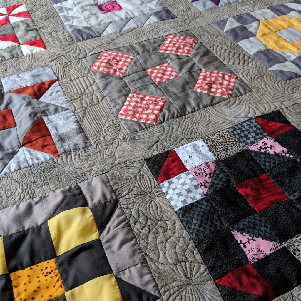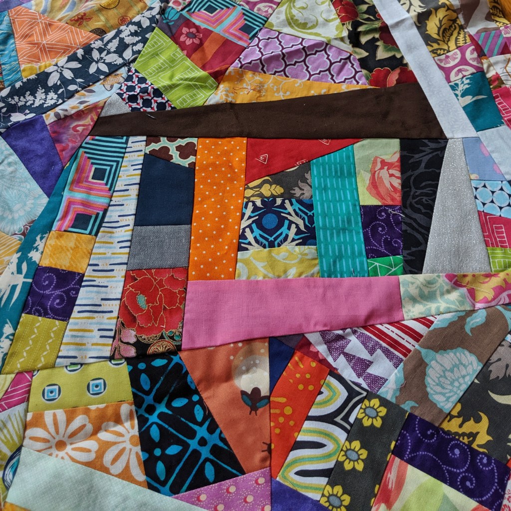 You may also notice that my batting looks a little wonky. That’s because I am a firm believer in using every scrap of batting I have before opening a new package. That means using the zigzag stitch on my sewing machine and “Frankenstein-ing” all my batting scraps together.