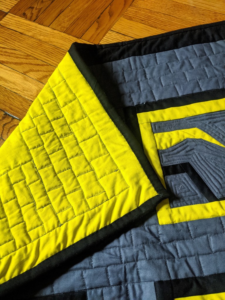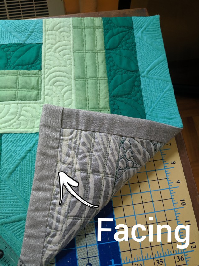 I’ve also used facing for several of my quilts, though usually for quilts that are meant to hang on walls. When you face a quilt, you basically pull the raw edges over to the back and cover them with a different kind of binding that won’t be seen on the front. This gives the quilt a frameless look. I really love facing my quilts when I want the viewer to imagine my quilting designs continuing off of the quilt.