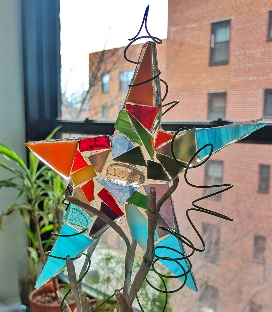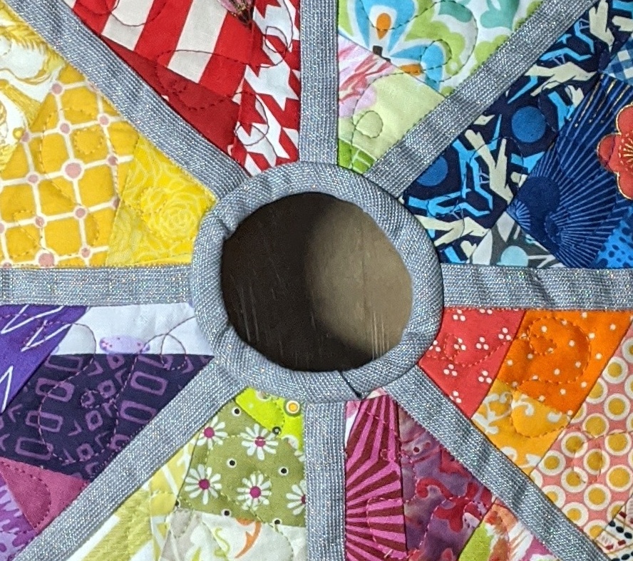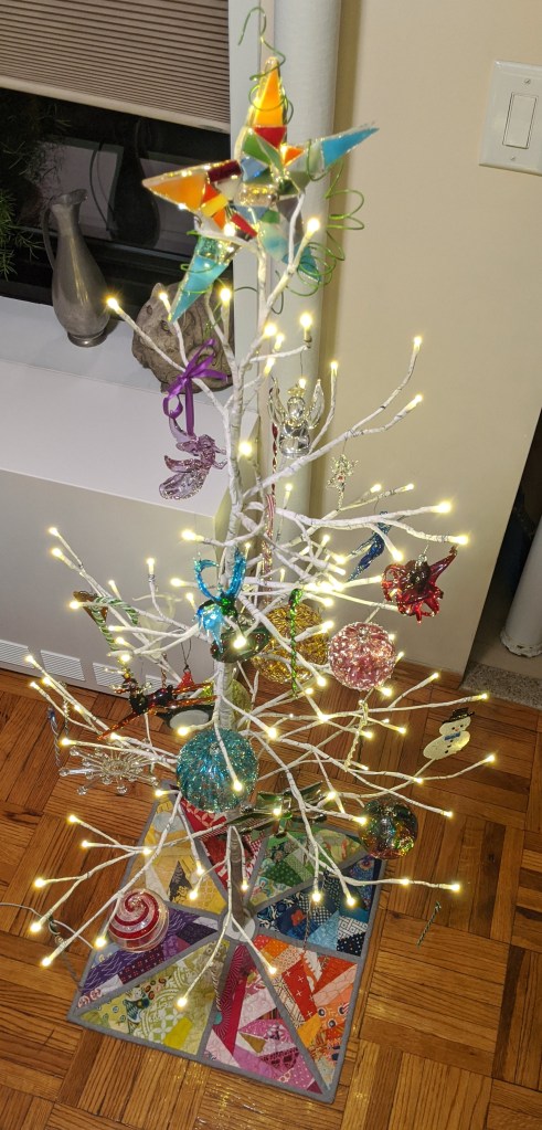 This is all a very long build-up to explain how I came about creating my Christmas tree skirt. One of the ornaments my mom gave us a few years ago was a fused-glass star, which I use as my tree topper. It’s super modern and colorful and awesome, and it inspired me to create an improv-pieced tree skirt using up some of the billions of scraps I’ve collected over the last few years of quilting.