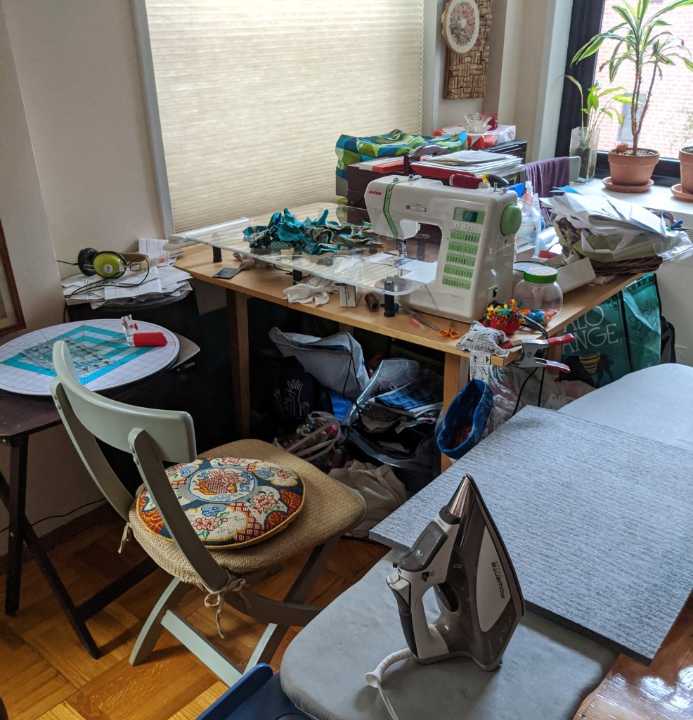 I set up my improv piecing station, consisting of my Martelli Round-About Cutting mat and Rotary Ergo cutter on one side of my sewing machine and my ironing board on the other. At that point, it was just a matter of sewing, pressing, and slicing, sewing, pressing, and slicing, sewing, pressing, and slicing, over and over again in each of the colorways until I had pieced enough scraps to fit with the triangular template.
